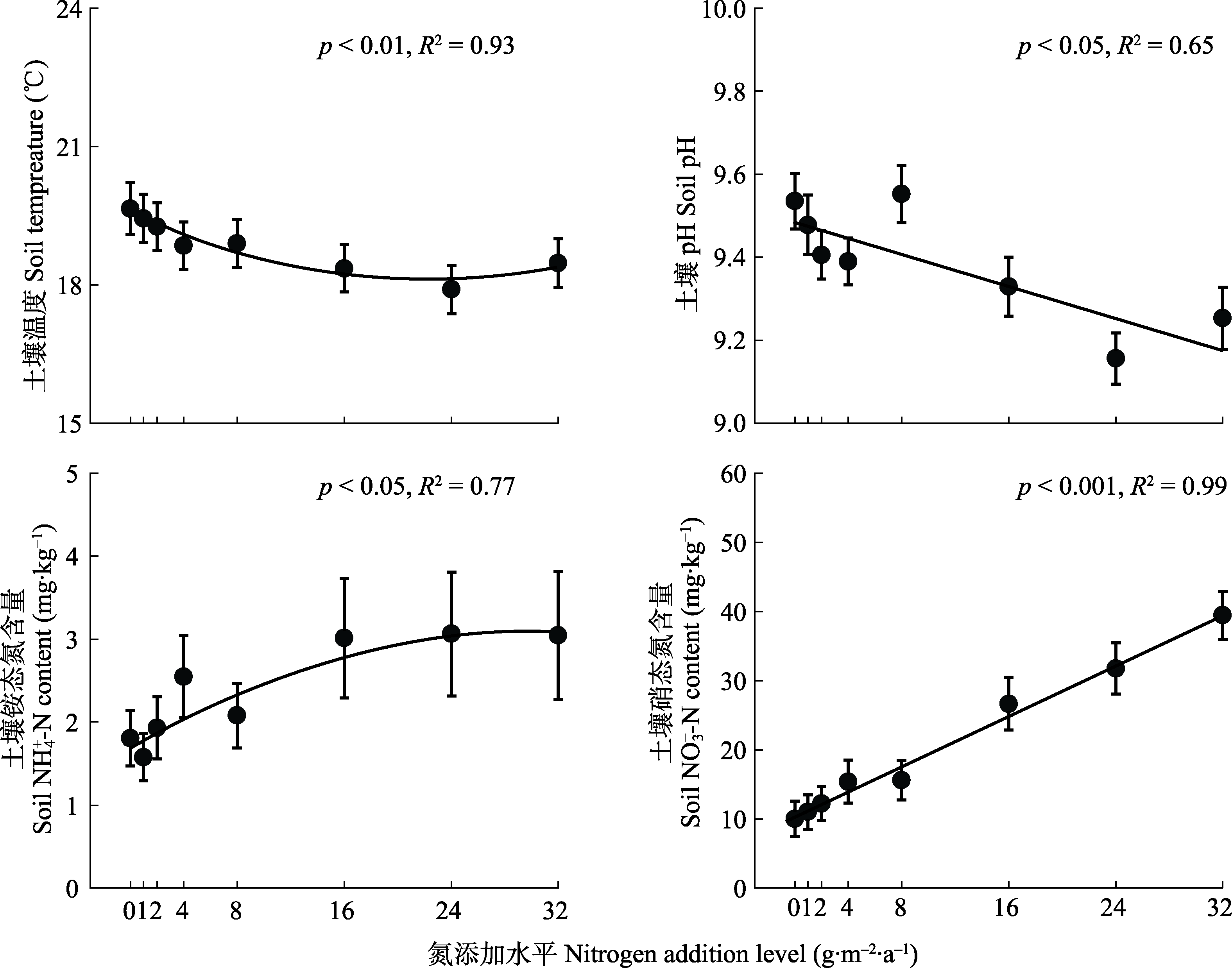 图2 不同水平氮添加对晋北赖草草地土壤温度(A)、pH (B)、NH4+-N含量(C)、NO-3-N含量(D)的影响(平均值±标准误)。