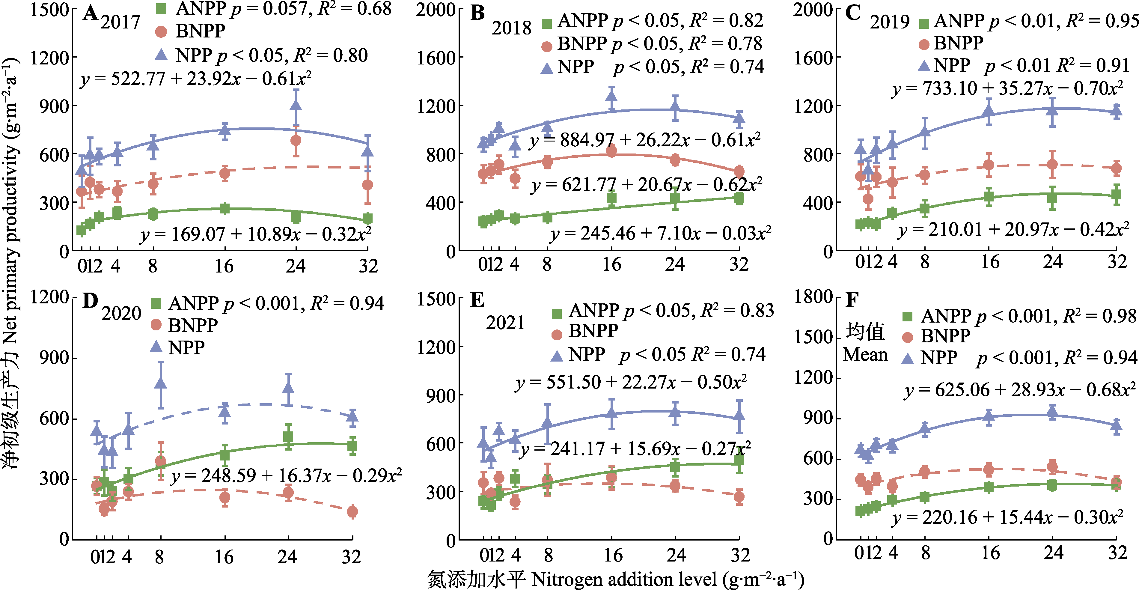 图3 2017-2021年晋北赖草草地植物净初级生产力随氮添加水平提高的响应阈值(平均值±标准误)。ANPP, 地上净初级生产力; BNPP, 地下净初级生产力; NPP, 净初级生产力。实线代表拟合方程显著(p < 0.05), 虚线代表拟合方程不显著(p > 0.05)。