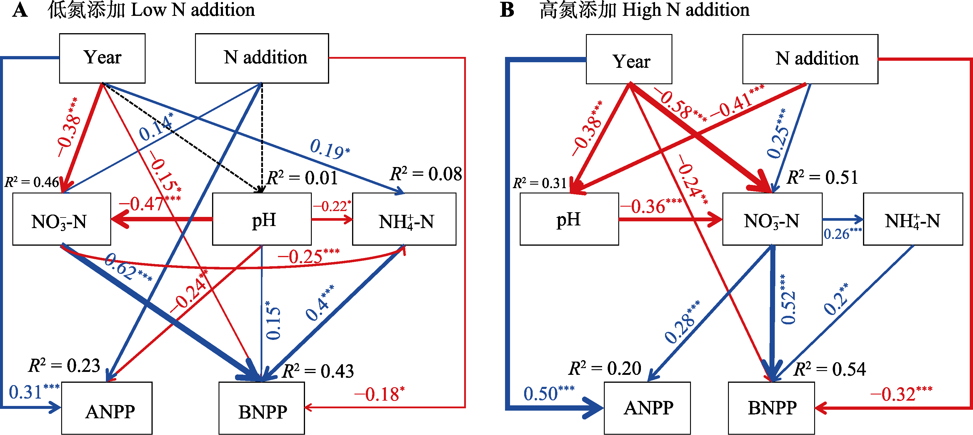 图6 基于结构方程模型的低氮(A)和高氮(B)添加对晋北赖草草地植物地上净初级生产力(ANPP)和地下净初级生产力(BNPP)直接和间接的影响。蓝色和红色线条分别表示显著的正相关和负相关关系, 黑色虚线表示相关性不显著。箭头和线条的宽度与相关性大小成比例; 低氮添加: p = 0.373, 赤池信息量准则(AIC) = 51.36, χ2 = 5.36, df = 5; 高氮添加: p = 0.614, AIC = 45.22, χ2 = 7.22, df = 9。N addition, 氮添加水平; NH4+-N, 土壤铵态氮含量; NO-3-N, 土壤硝态氮含量; pH, 土壤pH; ST, 土壤温度; SWC, 土壤含水量; Year, 处理年限。*, p < 0.05; **, p < 0.01; ***, p < 0.001。
