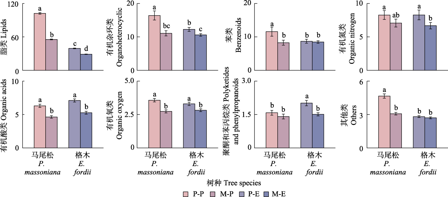 图2 不同林分马尾松和格木根系分泌物代谢产物的相对定量值(平均值±标准误)。不同小写字母表示不同树种之间的差异显著(p < 0.05)。M-E, 混交林格木; M-P, 混交林马尾松; P-E, 纯林格木; P-P, 纯林马尾松。