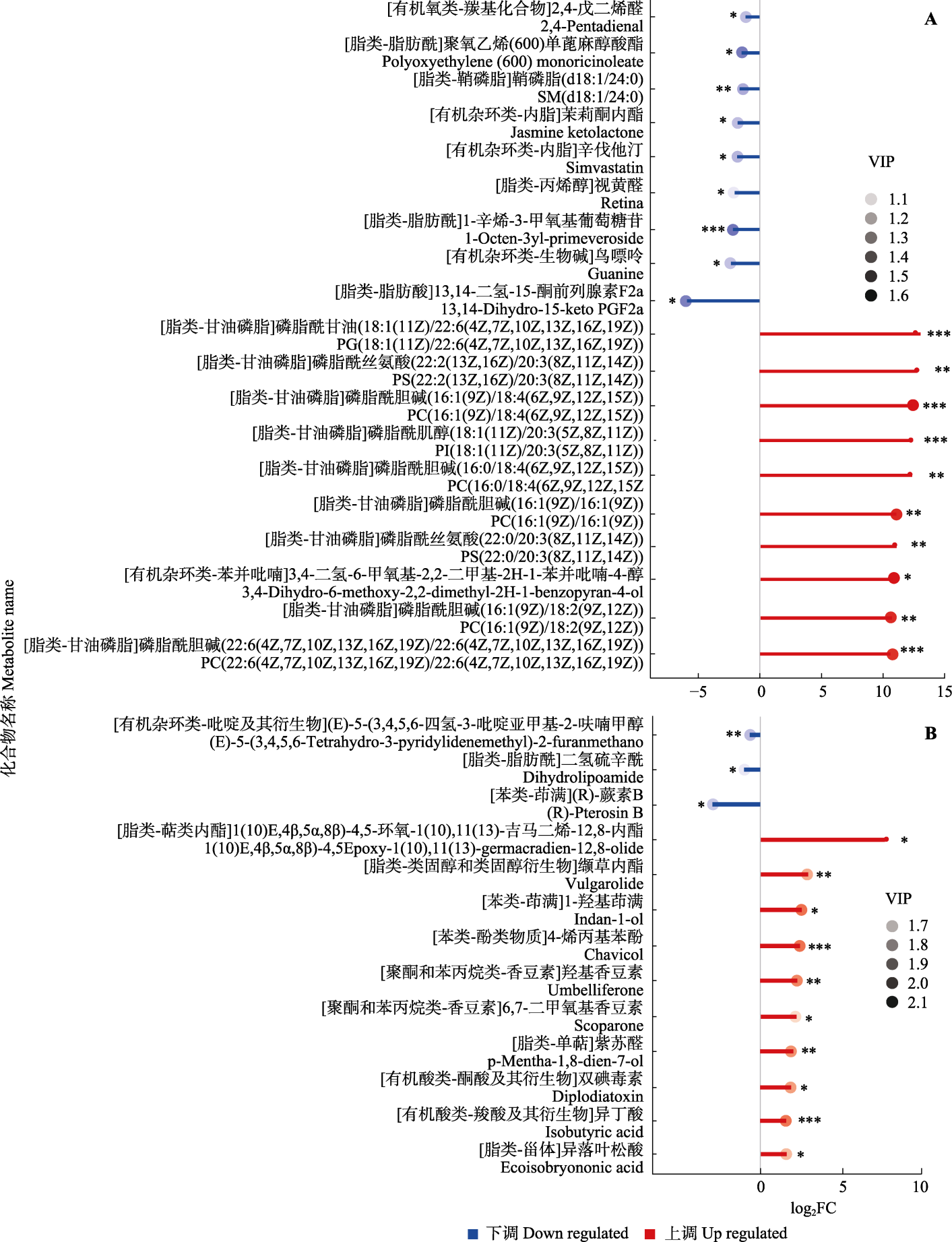 图3 纯林和混交林中马尾松(A)和格木(B)变量投影重要度(VIP)值排名前10的差异代谢物火柴杆图分析。化合物中文名称以[HMDB二级分类-HMDB三级分类]化合物名称表示; 点颜色深浅代表VIP值大小。*, p < 0.05; **, p < 0.01; ***, p < 0.001。