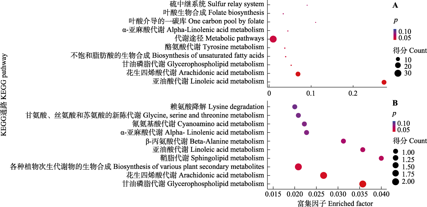 图4 纯林和混交林中马尾松(A)和格木(B)排名前10的差异代谢物KEGG通路富集图。KEGG, 京都基因与基因组百科全书。 圆点大小表示该通路中富集到的差异代谢物数量; 颜色表示p值大小, p值越小、颜色越偏红, 表示富集程度越显著。