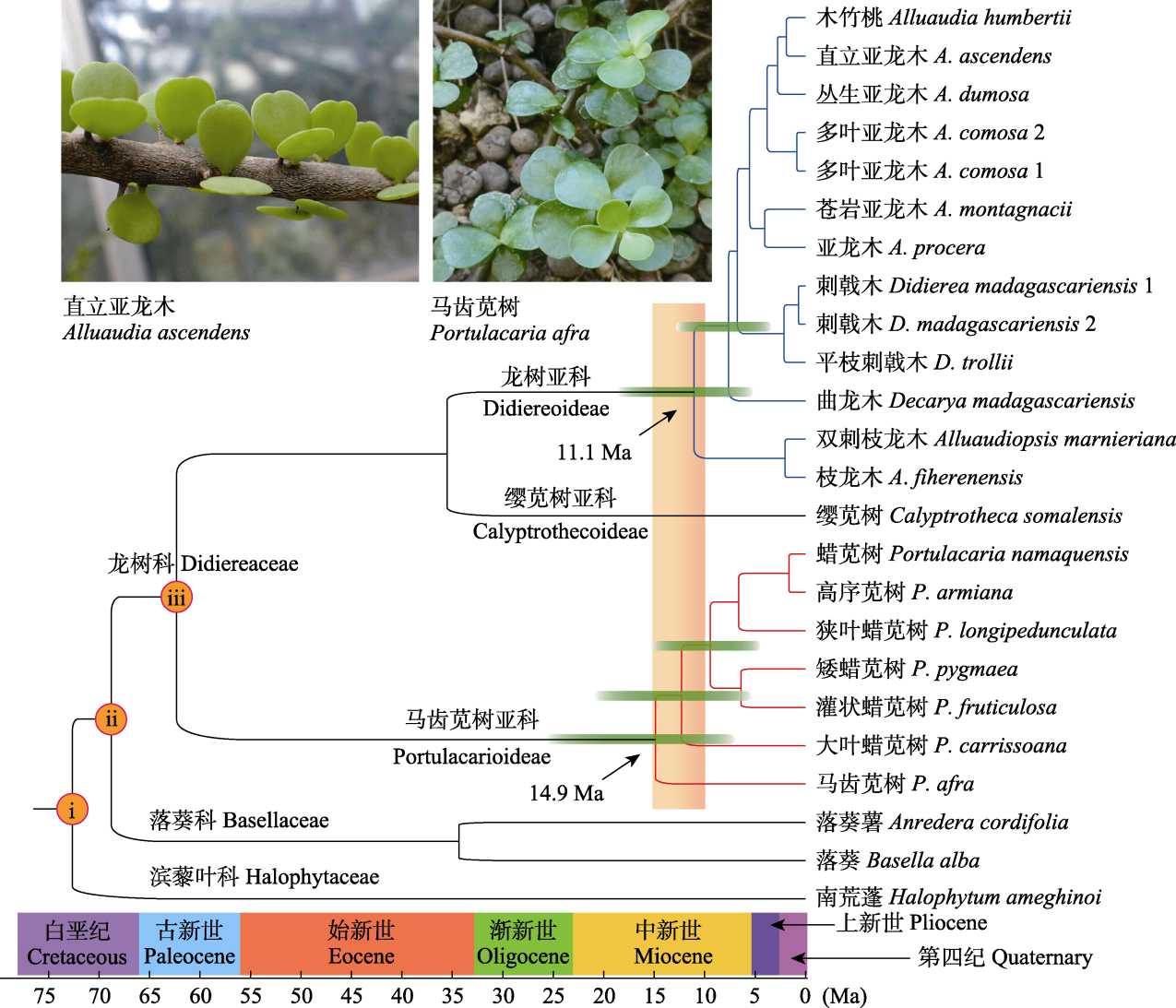 图2 龙树科物种直立亚龙木、马齿苋树枝条(示叶片肉质化)以及基于6个叶绿体序列片段联合矩阵与3个时间校准点采用BEAST分析所得龙树科物种水平分化时间图。i-iii为3个时间校准点, 其中i为南荒蓬科干群节点, ii为落葵科干群节点, iii为龙树科冠群节点。橙色条块示中新世中晚期15‒10百万年前(Ma)期间全球性干旱化事件发生的时间区间; 绿色横杠示关键节点分化时间的95%置信区间(95%最大后验密度)。