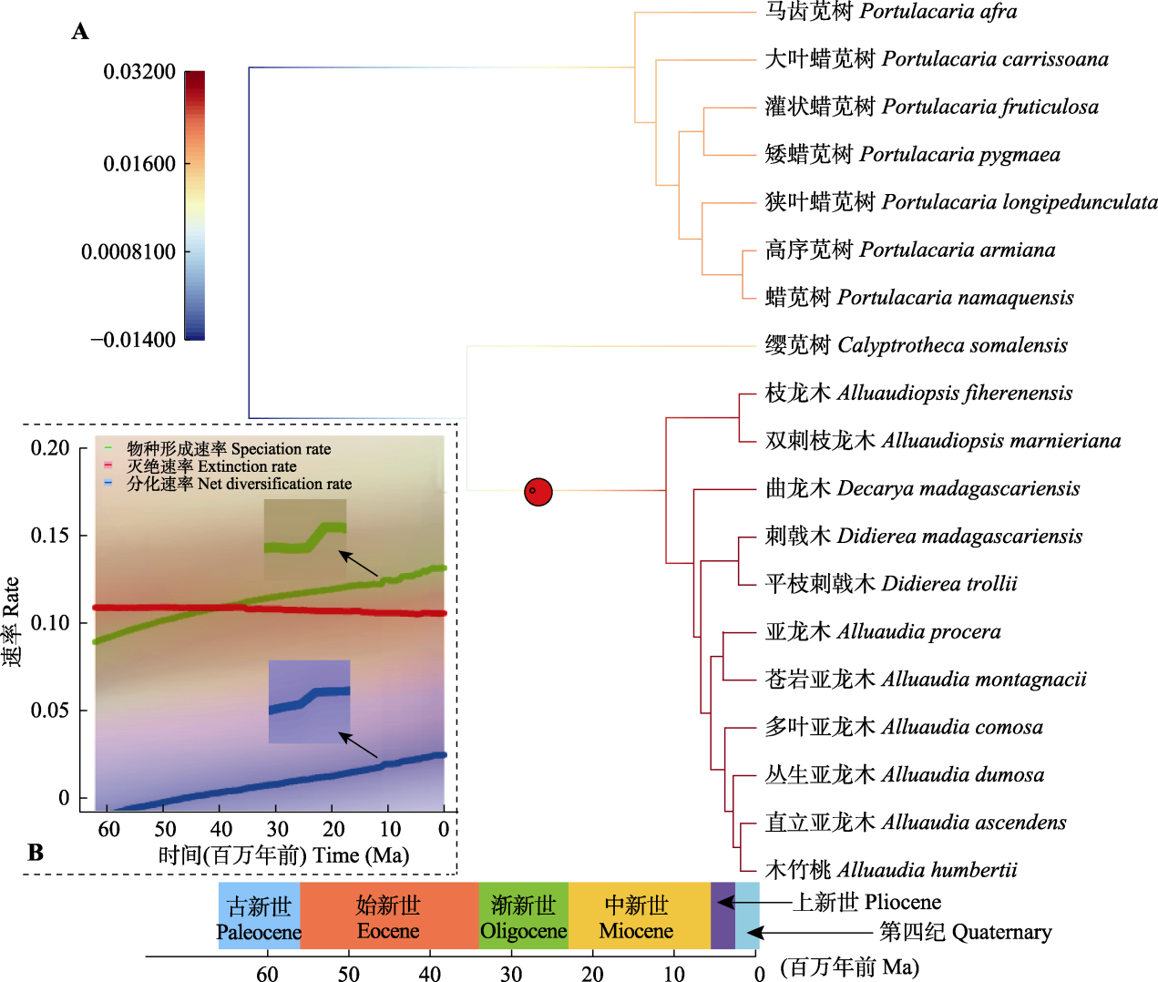 图3 基于时间树对龙树科进行物种多样化过程推测的基于宏观进化混合软件的贝叶斯分析(BAMM)分析结果。A, 龙树科Phylorate图, 分支颜色根据物种分化速率变化过程进行标记; 红点暗示该分支存在分化速率明显增加的转变波动。B, 龙树科物种形成速率、物种灭绝速率以及物种分化速率随时间波动的具体过程。