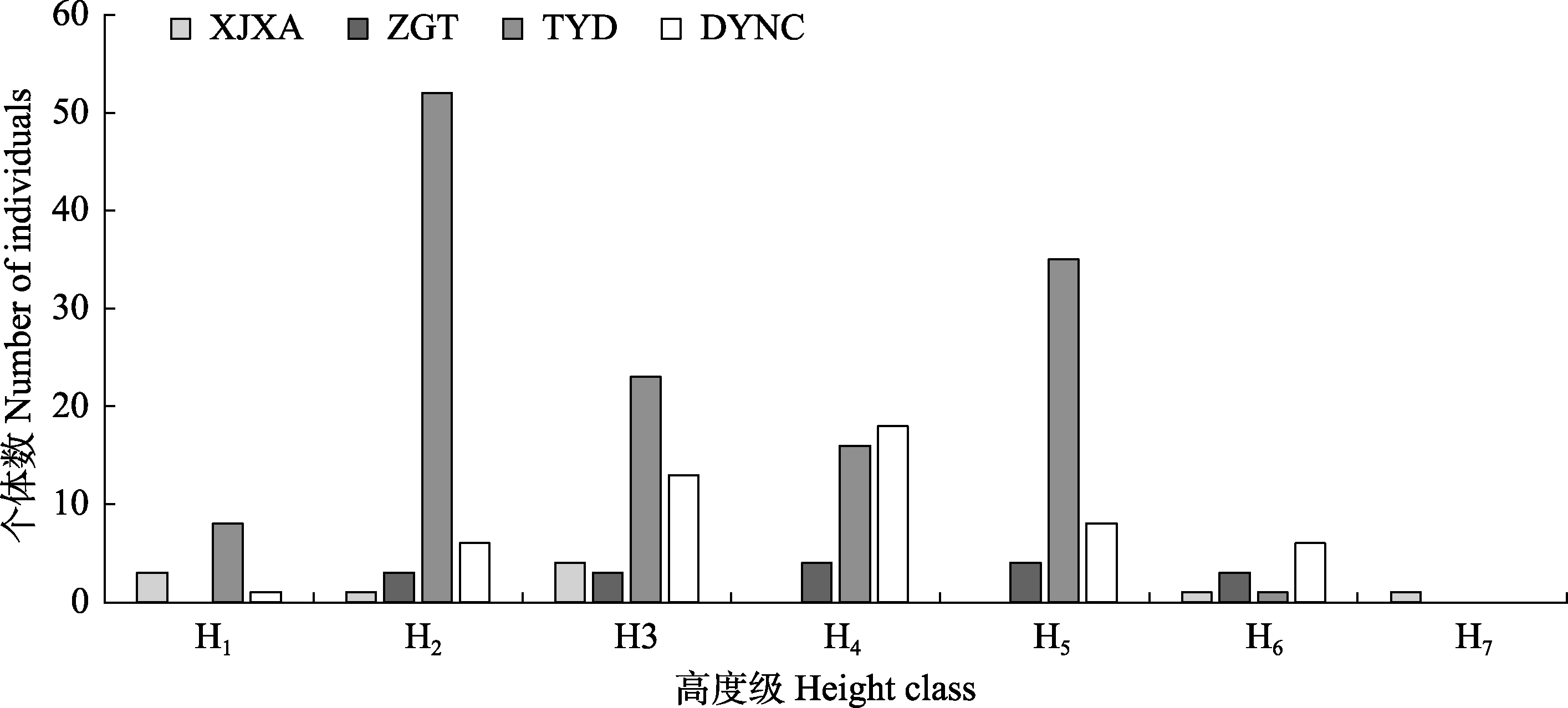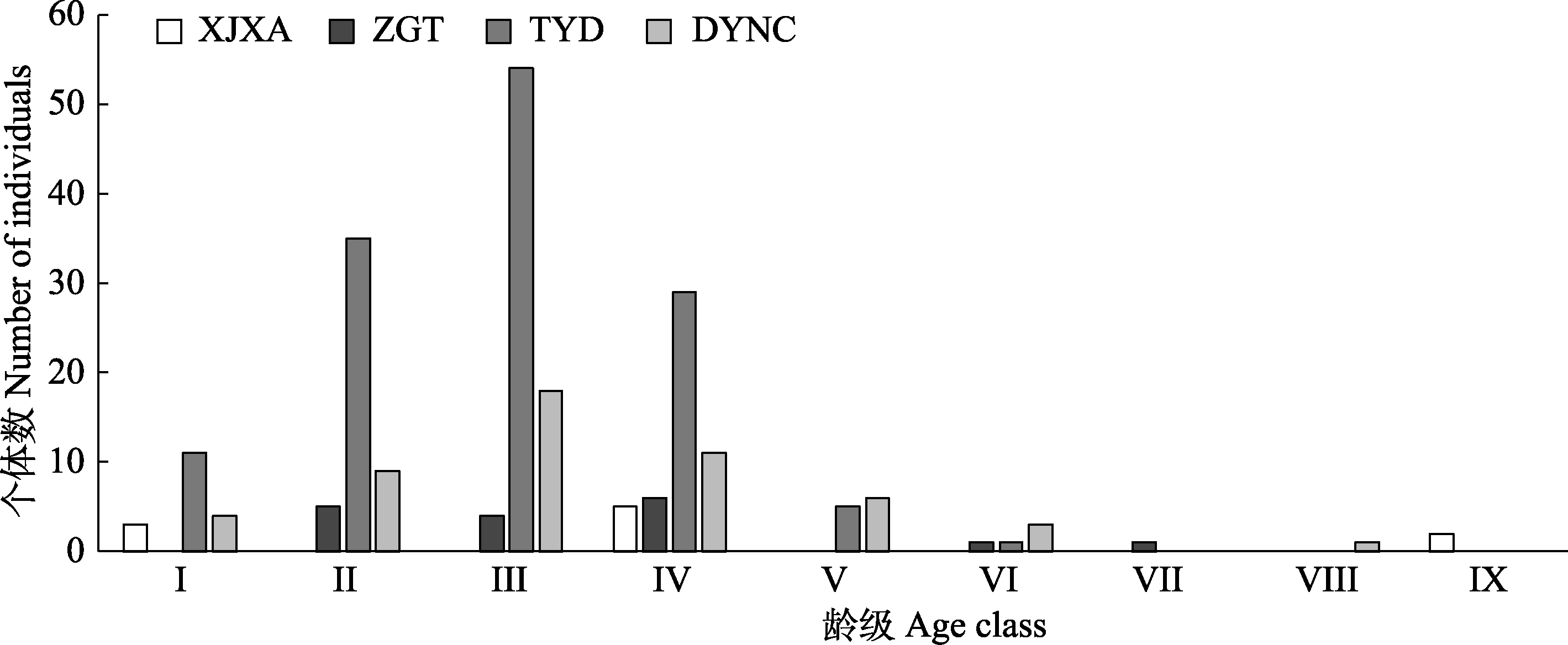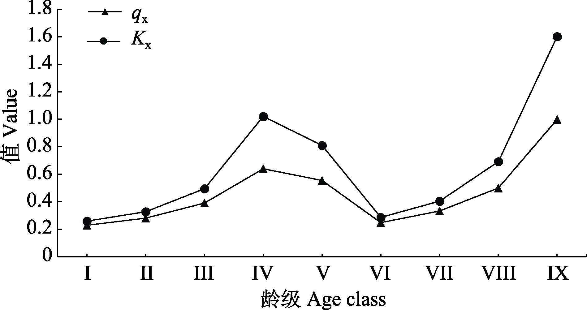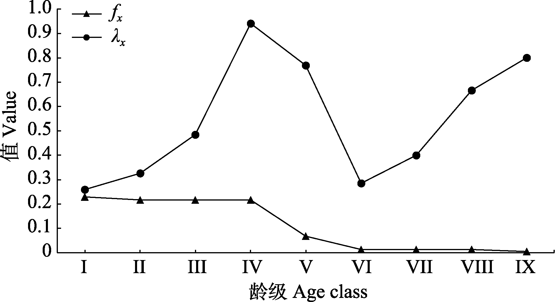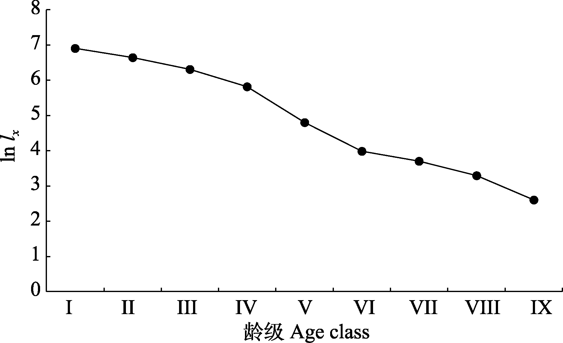摘要: 小溪洞杜鹃(Rhododendron xiaoxidongense)为我国特有的珍稀濒危植物, 狭域分布于罗霄山脉中段, 种群数量稀少, 曾被评估为灭绝(EX), 其资源状况和种群结构与动态不清楚, 严重制约了该物种的保护。该研究以现存的小溪洞杜鹃种群为研究对象, 通过空间代替时间的方法得到种群龄级结构, 据此计算种群动态指数、编制静态生命表、绘制存活曲线和生存函数曲线, 分析种群结构特征与生存潜力; 运用时间序列模型预测种群未来发展趋势, 并采用聚集度指标判断种群空间分布格局, 旨在明确小溪洞杜鹃种群生存状况、发展趋势及影响种群更新的关键因子, 为其野生种群保护、管理和复壮提供科学依据。结果表明: (1) 4个小溪洞杜鹃种群龄级结构均不完整, 总体表现为中龄、成龄个体较多, 低龄及老龄个体严重不足, 属衰退型。(2)相邻龄级间的动态指数随着龄级增大呈“衰退—增长—稳定—衰退”的波动变化, 忽略外部干扰时的动态指数>考虑外部干扰时的动态指数(V′pi) > 0, Vpi趋近于0, 对外部干扰所承担的风险概率最大值为11.11%, 表明该种群受外部干扰风险概率高, 抗干扰能力弱。(3)期望寿命在I龄级时最大, 存活曲线为Deevey-II型。(4)死亡率和消失率曲线呈“升高—降低—升高”动态变化, 种群处于不稳定状态。(5)生存函数曲线呈现前期锐减、中期相对稳定和后期缓慢衰退的趋势, 并在较小的龄级(2.25龄)进入衰退期, 表明种群生存力较弱。(6)在未来2、4、6和8个龄级时间后, 低龄、中龄个体数减少, 成龄、老龄个体数增多, 种群面临衰退风险。(7)种群分布格局总体表现为集群分布, 但随着龄级增大聚集度减弱, 并在VII-VIII龄级时过渡到随机分布。综上所述, 种群个体数量少、分布地狭窄、抗干扰能力弱及幼苗更新困难是导致小溪洞杜鹃濒危的主要原因。建议加强小溪洞杜鹃种群的生境保护与抚育管理, 并结合野外回归和近地保护, 多途径实现种群保护与复壮。