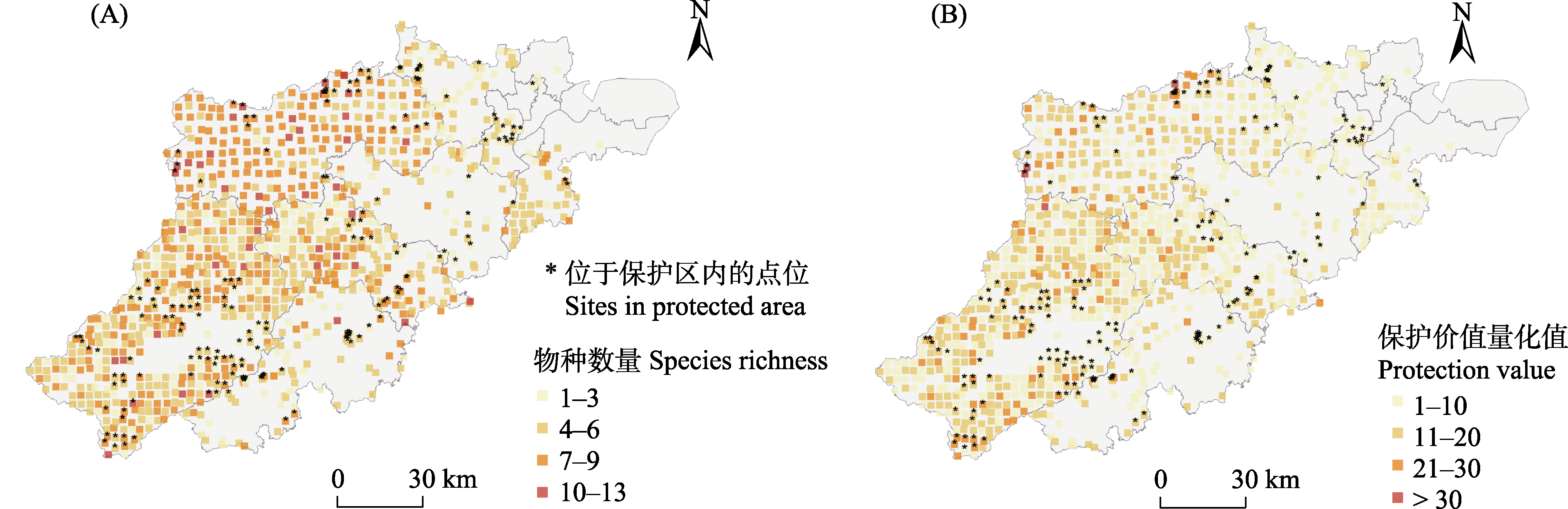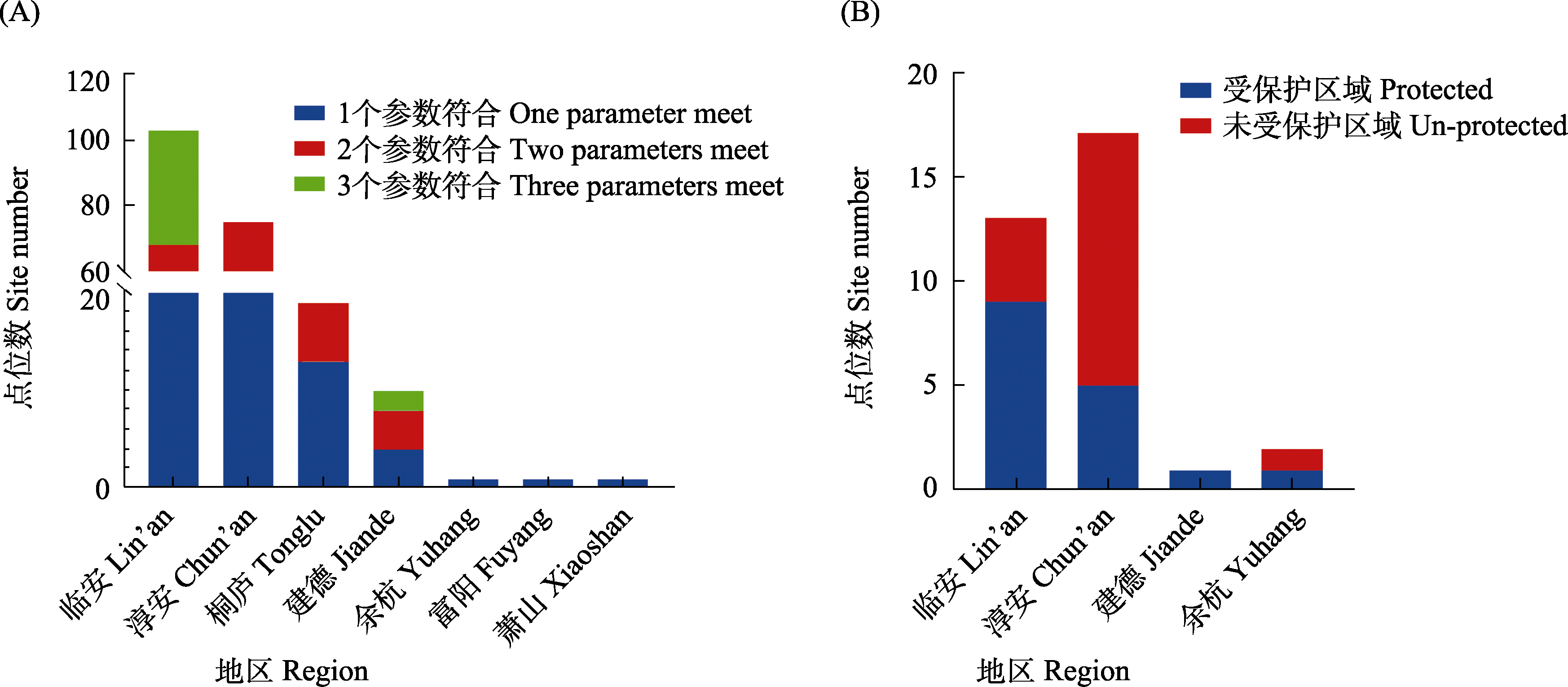 图3 杭州市不同区域的物种丰富度(物种数量)、生物多样性指数(Shannon指数)、保护价值量化值3个参数前10%的点位分布情况(A)和重点保护物种分布点位受保护情况(B)