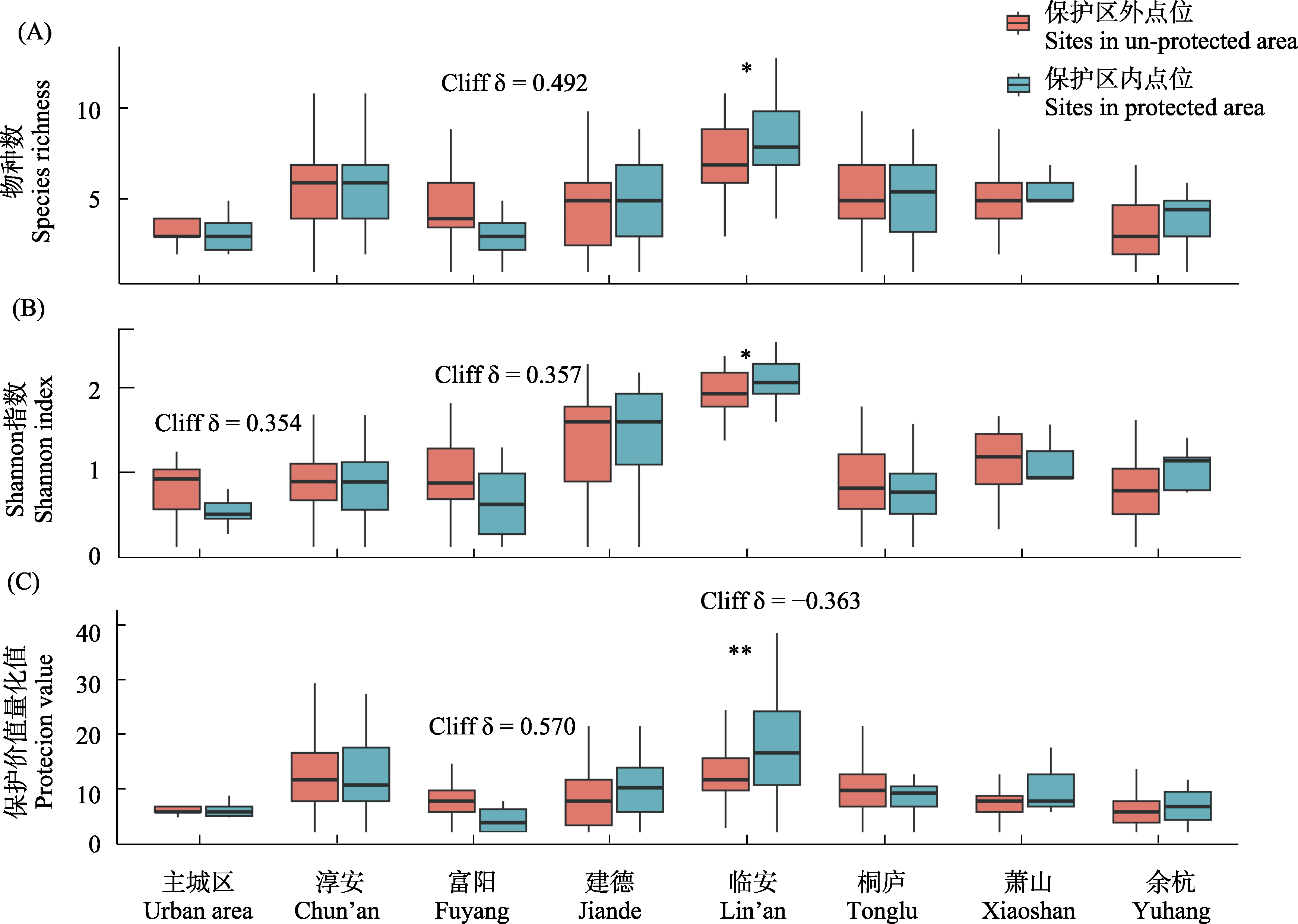图2 杭州市不同行政区划的物种数量(A)、Shannon指数(B)和保护价值量化值(C)在保护区内外的比较。P为FDR校正后数值, * P < 0.05, ** P < 0.01。Cliff δ值为可忽略(|δ| < 0.147)和小效应(|δ| < 0.330)的未列出。