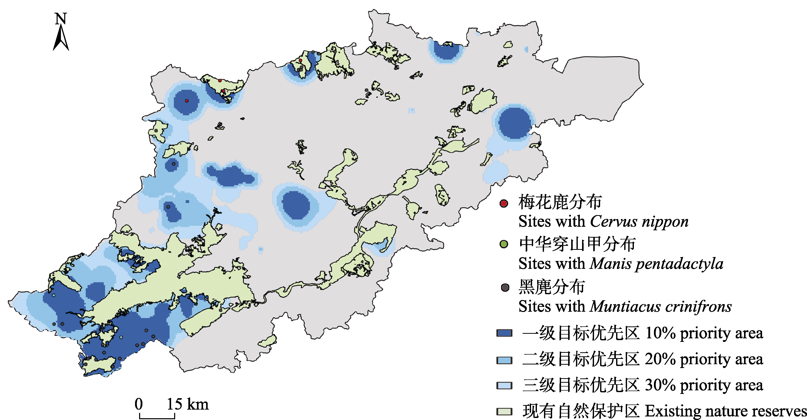 了解区域内物种的空间分布格局和种群数量, 是制定科学有效保护策略的关键依据, 城市生物多样性更是城市自然生产力和生态系统稳定的重要基础。本研究基于杭州市全域红外相机监测数据, 系统分析区域内物种的空间分布格局, 利用随机相遇模型估算种群密度, 占域模型评价栖息地利用影响生态因素, Zonation评估杭州市珍稀濒危物种保护优先区。结果显示: (1)共记录到147个物种, 包括兽类7目18科30种, 鸟类11目36科117种, 其中兽类以小麂(Muntiacus reevesi)、花面狸(Paguma larvata)、鼬獾(Melogale moschata)和猪獾(Arctonyx collaris)数量较高, 鸟类则以白鹇(Lophura nycthemera)数量最高。(2)物种多样性空间分布呈现明显异质性, 临安和淳安是重点保护物种的主要分布区, 黑麂(Muntiacus crinifrons)、中华鬣羚(Capricornis milneedwardsii)等珍稀物种集中分布于此, 而梅花鹿(Cervus nippon)仅见于临安的自然保护区内; 淳安发现了具有重要生态意义的豹猫(Prionailurus bengalensis)种群, 余杭区则分布有貉(Nyctereutes procyonoides)和亚洲狗獾(Meles leucurus)等适应城市周边生态系统的食肉目物种。(3)对于广泛分布的物种, 海拔是影响其在杭州市分布的重要因素。(4)基于红外相机监测到的小型兽类和地栖性鸟类数据, 系统评估识别出优先区总面积5,068.85 km2; 现有自然保护地有54.3%位于该30%优先区内, 覆盖了目标优先区的20.74%, 主要为国家级保护体系(天目山国家级自然保护区、清凉峰国家级自然保护区和富春江-新安江国家级风景名胜区)。在淳安西部和西北部的山区、萧山湘湖、临安岛石镇和清凉峰镇及桐庐百江镇山区存在保护空缺。这些发现为优化杭州市生物多样性保护网络、完善保护地体系建设提供了科学依据, 特别是对临安和淳安等关键区域的保护管理具有重要指导意义。
