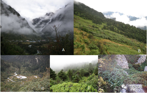 A.藏东南的扎日神山, B. 神龙架巴山冷杉与杜鹃植被, C. 西藏隆子的森林与高位湿地, D. 滇西北的冷杉森林与杜鹃灌丛, E. 秦岭太白山的太白杜鹃R. taibaiense 群丛