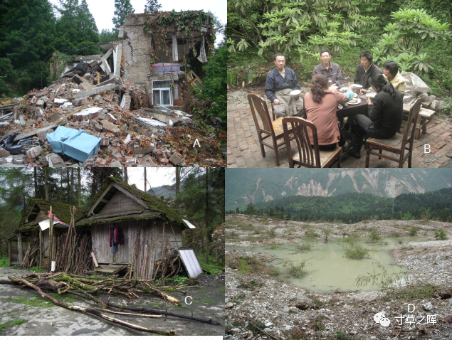 地震后的惨状:A. 办公楼彻底坍塌, C.幸存的小木屋, D. 滑坡堆积之下是原来的露地苗圃, 损失约10万株, 50种杜鹃花, B. 还得吃饭!