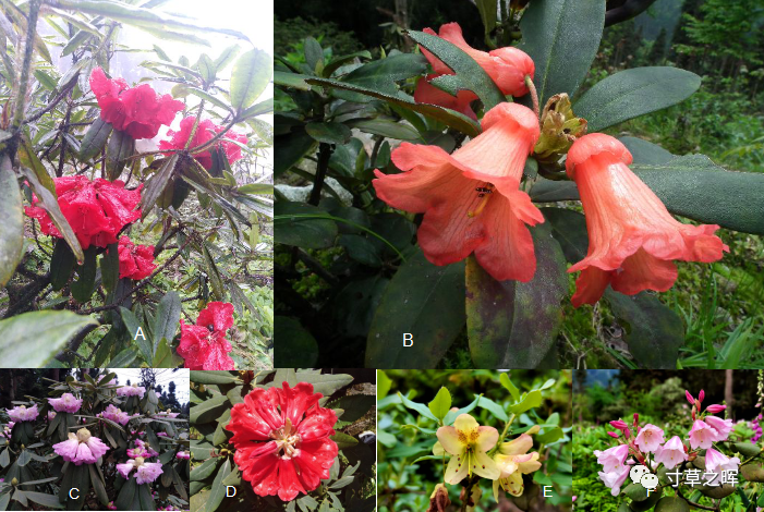 A.峨眉山的芒刺杜鹃R. strigillosum,B.碧落雪山的美艳橙黄杜鹃R. citriniflorum var. horaeum ,C.秦巴山的早春杜鹃R. praevernum,D.滇西的绵毛房杜鹃R. facetum,E.藏南的黄绿杜鹃R. viridescens(王飞摄),F.猫儿山的越峰杜鹃 R. yuefengense