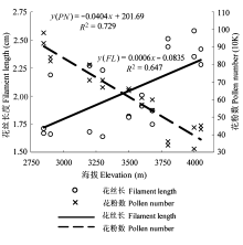 由图4可以看出, 花瓣重量与海拔呈正相关关系, 即海拔越高, 花瓣重量越大(p < 0.05)。花柱长随海拔升高而增大, 两者呈正相关关系(p < 0.05)。