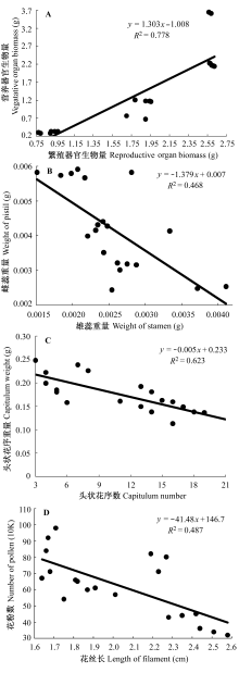 通过采样调查法和烘干称量法, 检测了青藏高原东缘不同海拔20个居群星状风毛菊(Saussurea stella)的花部特征, 研究其花部特征对海拔及个体大小的响应。结果表明: 1)繁殖分配是依赖个体大小的, 个体越大, 繁殖分配越小; 2)花期繁殖器官和营养器官的生物量、头状花序的数量及大小、雌雄功能以及雄性内部花丝与花粉之间均存在资源分配上的权衡; 3)星状风毛菊通过花部特征的变异响应海拔的变化。研究发现, 星状风毛菊通过花部特征的变异, 特别是花柱和花丝的伸长及投入更多资源于吸引结构花瓣, 以此来补偿该种在高海拔地区因传粉者减少、活动频率降低和花粉数减少等因素对传粉带来的影响, 使其能够在高海拔的胁迫环境下有效地传粉, 完成有性繁殖。 ![]() View image in article