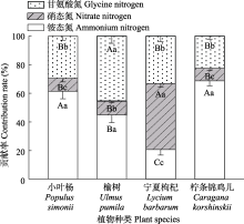 土壤环境与植物自身属性影响着植物氮吸收, 明确河北坝上不同植物根系氮吸收偏好及其与土壤属性和根性状的关系, 可以增进对植物氮获取策略的理解, 同时为河北坝上混交防护林的构建提供理论依据。该研究选取张家口市康保县常见的农田防护林树种: 榆树(Ulmus pumila)、小叶杨(Populus simonii)、柠条锦鸡儿(Caragana korshinskii)和宁夏枸杞(Lycium barbarum)为研究对象, 采用15N同位素示踪技术测定植物根系对不同形态氮(硝态氮、铵态氮和甘氨酸氮)的吸收速率及其偏好, 并分析其与根系形态、构型和化学性状以及土壤环境的相关关系。结果显示: 宁夏枸杞根系偏好吸收硝态氮(硝态氮占总氮吸收的贡献率为46.05%), 其次是甘氨酸氮和铵态氮。小叶杨、榆树和柠条锦鸡儿根系各形态氮吸收的贡献率为铵态氮(44.91%-68.68%) >甘氨酸氮(22.63%-45.11%) >硝态氮(8.69%-9.98%)。Spearman相关性和冗余分析显示: 硝态氮的吸收速率与根直径和组织密度显著负相关, 与比根长和比表面积显著正相关, 即具有小的直径和组织密度、大的比根长和比表面积的根系表现出更高的硝态氮吸收速率。根分支强度与甘氨酸氮和总氮吸收速率显著正相关, 即具有高分支强度的根系其有机和无机氮吸收速率更高。根氮含量与铵态氮、甘氨酸氮和总氮吸收速率均显著负相关, 即低氮含量的根系表现出更高的氮吸收速率。4种防护林植物对3种形态氮的吸收存在显著差异, 其不仅与土壤氮含量有关, 还与植物根系自身的形态、构型和化学性状有关。基于植物氮吸收偏好以及根系结构性状与土壤肥力的影响综合考虑树种搭配, 在养分贫瘠的环境需减小植物的种间竞争, 最大限度地利用养分, 因此建议构建乔木-灌木(小叶杨-宁夏枸杞、榆树-宁夏枸杞)、灌木-灌木(宁夏枸杞-柠条锦鸡儿)混交防护林, 或是在原有小叶杨纯林或榆树纯林的林下补栽灌木宁夏枸杞。研究结果为河北坝上地区多树种防护林的构建提供理论依据。