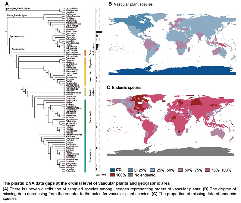 RESULTS: Only 33.75% vascular plant species have at least one record of DNA in GenBank, covering 139 005 vascular plant species (angiosperms: 131 220 species, gymnosperms: 1 154 species, and pteridophytes: 6 631 species). For data gap in species, sequenced species were unevenly sampled among lineages, with the proportion of missing data generally correlated with species richness within the lineages. The top three orders of the highest proportion of missing data were Paracryphiales, Piperales, and Dilleniales, and the top three families were Triuridaceae, Pentaphragmataceae, and Xyridaceae. For data gap in geographic area, the proportion of missing data of plastid DNA of vascular plant species showed a trend of latitudinal gradient, with the degree of missing data decreasing from the equator to the poles. Regions with high proportion of missing data usually possess high biodiversity, including many biodiversity hotspots. In addition, endemic species were generally with the high proportion of missing data in the majority of regions.