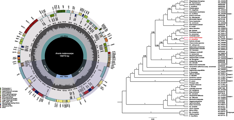 Map of the chloroplast genome of Aronia melanocarpa and phylogenetic analyses among the 60 Rosaceae species using their complete chloroplast genomes. Aronia formed a clade with Dichotomanthes and Pourthiaea based on cpDNA tree. Moreover, A. melanocarpa is most closely related to A. arbutifolia and forms a sister clade to Cydonia oblonga with weak support.