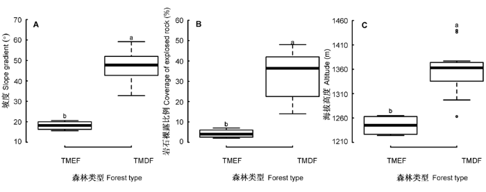 热带山地常绿林(TMEF)和热带山顶矮林(TMDF)地形因子的比较。A, 坡度。B, 岩石裸露比例。C, 海拔高度。箱线图上不同字母(a, b)表示两者有显著差异(p < 0.05)。