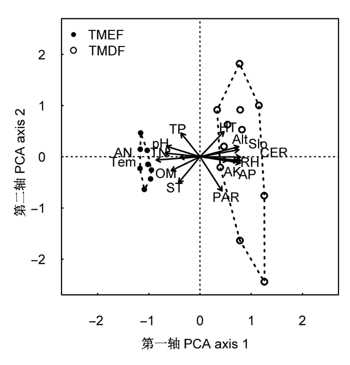 热带山地常绿林(TMEF)和热带山顶矮林(TMDF)样方随环境变量变化的PCA排序图。AK, 有效钾; Alt, 海拔高度; AN, 速效氮; AP, 有效磷; CER, 岩石裸露比例; HT, 腐殖质厚度; OM, 有机质; PAR, 光合有效辐射; RH, 日平均空气相对湿度; Slo, 坡度; ST, 土壤厚度; Tem, 日平均空气温度; TK, 全钾; TN, 全氮; TP, 全磷。