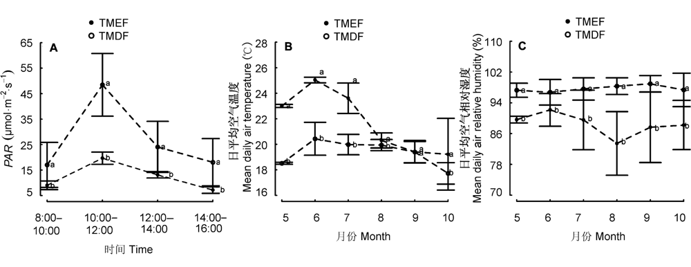 | 图1 热带山地常绿林(TMEF)和热带山顶矮林(TMDF)间光合有效辐射(PAR)和日平均空气温度湿度的比较(平均值±标准误差)。A, 光合有效辐射。B, 日平均空气温度。C, 日平均空气相对湿度。不同字母(a, b)表示两者有显著差异(p < 0.05)。 |