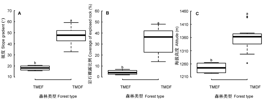 | 图2 热带山地常绿林(TMEF)和热带山顶矮林(TMDF)地形因子的比较。A, 坡度。B, 岩石裸露比例。C, 海拔高度。箱线图上不同字母(a, b)表示两者有显著差异(p < 0.05)。 |