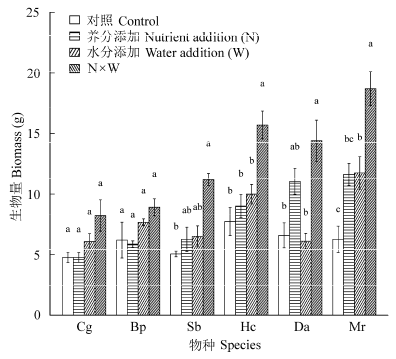 图1 养分、水分处理下的植物生物量(平均值±标准误差)。Hc, 黄茅; Bp, 孔颖草; Cg, 橘草; Da, 双花草; Sb, 裂稃草; Mr, 红毛草。物种内不同字母表示处理间存在显著性差异(p < 0.05)。