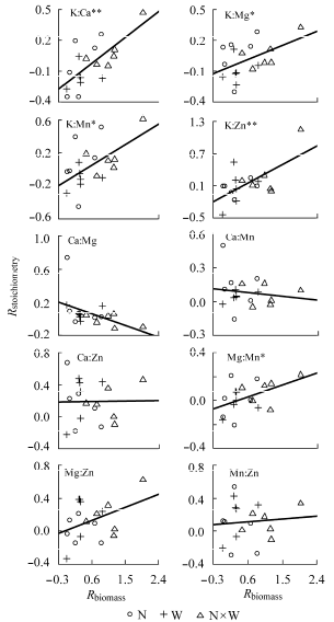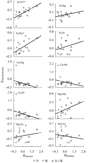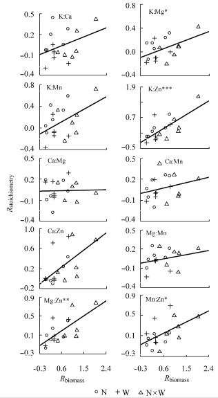 本研究结果显示植物根茎叶以及总体K、Ca、Mg、Mn、Zn含量及其化学计量特征对水分、养分处理下生物量变化具有明显的响应。这些元素基本上可分为三大类: 第一类是K, 第二类是Ca、Mg, 第三类是Mn、Zn。从元素含量的高低顺序来看, 植物含量较高的元素在生物量变化中较为稳定, 而微量元素则随着生物量增加有降低趋势。这使得含量较高的元素与含量较低的元素计量关系发生了极大变化, 导致第一类元素与第二、三类元素的计量比、第二类元素与第三类元素的计量比随着生物量增加而不断增加。