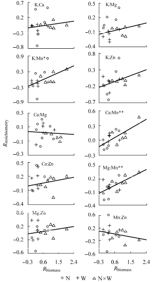 植物在养分和水分处理时的生物量变化可能影响了植物对元素的吸收平衡。本研究发现元素计量比的变化趋势似乎与元素含量具有一定的联系, 如本研究中元素含量的排序为K > Ca > Mg > Mn > Zn, 而大部分情况下这些元素计量比的变化与生物量变化成正比。如植物总体K:Mg、K:Mn、K:Zn比值变化与生物量变化成正比, 这与K含量大于Mn、Zn含量一致, 表明元素含量越高的元素与含量较低的元素比值随着生物量的增大而不断增大。即便是大量元素内部(如植物总体K:Ca、K:Mg), 或者微量元素内部(如茎干Mn:Zn)元素计量关系的变化也与生物量变化呈正相关关系。