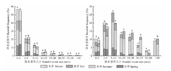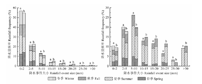 Table 3 F-statistical analysis of frequency and precipitation of small (<5 mm) and large rainfall (>10 mm) events during 1968-2000 and 2001-2012 in different seasons (spring, summer, fall and winter)
