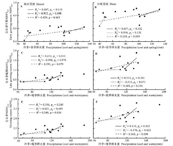 Fig. 3 Relationships between the growing season accumulated normalized difference vegetation index (NDVIINT) (early growing season, late growing season) and precipitation during the wet and dry years in dune and desert ecosystems. Triangles, rectangles and circles indicated NDVIINT in dry years (2001-2003), wet years (2004-2007), and normal years (2000, 2008-2012), respectively. R2, Rd2, Rw2 and p, pd, pw indicated the adjusted coefficient of determination and the probability values of significance test at dry and wet climate period (2001-2007), dry years, wet years.