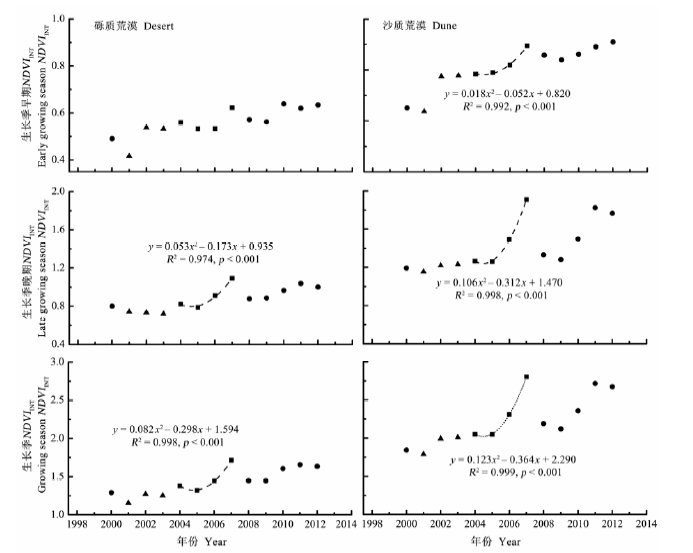 Fig. 5 Changes of accumulated normalized difference vegetation index (NDVIINT) during the wet and dry years at dune and desert. Triangles, rectangles and circles indicated NDVIINT in dry years (2001-2003), wet years (2004-2007) and no-trend years (2000, 2008-2012), respectively. The number of consecutive wet years is indicated in the quadratic function of the independent variable (x).
