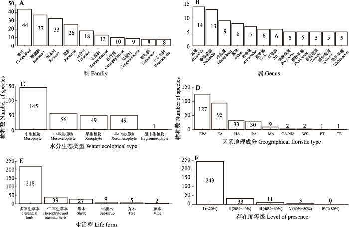 虎榛子群系的科(A)、属(B)、水分生态类型谱(C)、物种区系地理成分(D)、生活型谱(E)和存在度(F)。CA-MA, 中亚-亚洲中部分布种; EA, 东亚分布种; EPA, 东古北极分布种; HA, 泛北极分布种; MA, 亚洲中部分布种; PA, 古北极分布种; PT, 泛温带分布种; TE, 古地中海分布种; WS, 世界分布种。