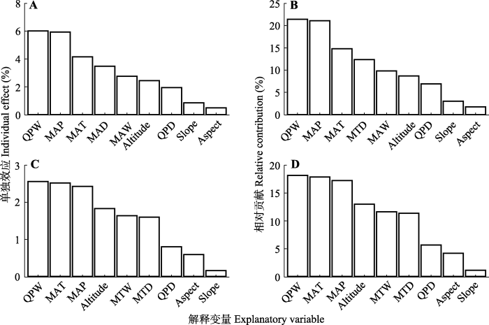 环境因子对内蒙古虎榛子群系灌木层(A、B)、总群落(C、D)物种组成的单独效应与相对贡献图。Altitude, 海拔; Aspect, 坡向; MAP, 年降水量; MAT, 年平均气温; MTD, 最干季平均气温; MTW, 最湿季平均气温; QPD, 最干季降水量; QPW, 最湿季降水量; Slope, 坡度。