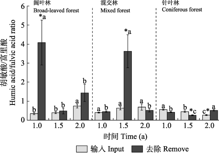 川西亚高山3种林型凋落物自然输入与去除土壤的胡敏酸/富里酸(平均值±标准误)。不同小写字母表示同一林型相同处理下不同采样时间土壤胡敏酸/富里酸差异显著(p < 0.05)。*, 同一采样时间凋落物自然输入与凋落物去除之间差异显著(p < 0.05)。