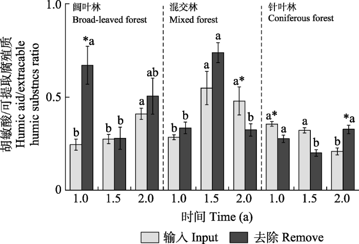 研究表明, 土壤PQ与HA/FA在不同林型间表现出相同的变化趋势(图3)。在凋落物去除处理中, 阔叶林土壤PQ在1年和2年均大于0.5, 针阔混交林在1.5年大于0.5, 说明土壤中HA对腐殖质总量的贡献大于FA, 土壤腐殖化程度较高。针叶林整体PQ小于0.5, 说明土壤腐殖化程度较低。总的来说, 土壤腐殖化程度表现为: 针阔混交林>阔叶林>针叶林。