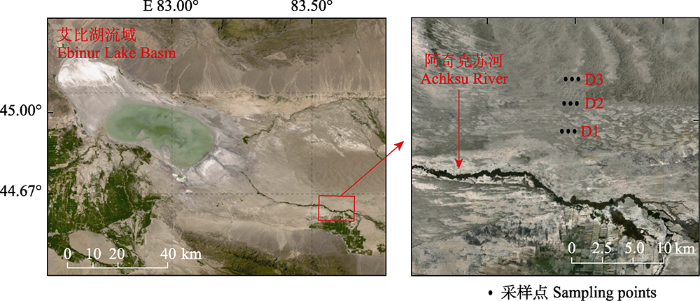 艾比湖流域研究区采样示意图。D1、D2和D3表示轻度、中度和重度干旱的样地。