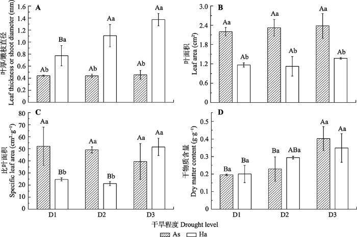 骆驼刺(As)和梭梭(Ha)的叶功能性状随干旱程度的变化以及种间差异(平均值±标准差)。D1、D2和D3表示轻度、中度和重度干旱。大写字母是单因素方差分析的结果, 表示同物种的功能性状随干旱程度的变化, 不同字母表示显著差异(p < 0.05)。小写字母是独立样本t检验的结果, 表示在同一干旱程度下, 功能性状在梭梭和骆驼刺之间的差异, 不同字母表示显著差异(p < 0.05)。