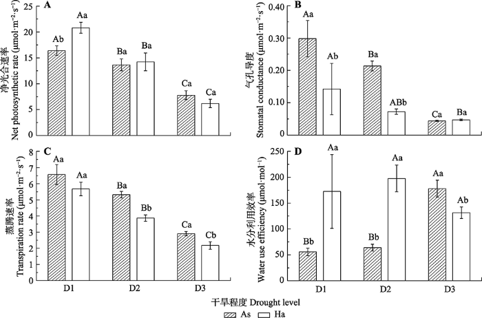 骆驼刺(As)和梭梭(Ha)的光合性状随同干旱程度的变化以及种间差异(平均值±标准差)。D1、D2和D3表示轻度、中度和重度干旱。大写字母是单因素方差分析的结果, 表示同物种的功能性状随干旱程度的变化, 不同字母表示显著差异(p < 0.05)。小写字母是独立样本t检验的结果, 表示在同一干旱程度下, 功能性状在梭梭和骆驼刺之间的差异, 不同字母表示显著差异(p < 0.05)。