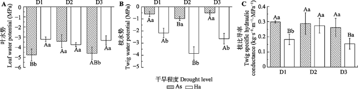 骆驼刺(As)和梭梭(Ha)的水力性状随同干旱程度的变化以及种间差异(平均值±标准差)。D1、D2和D3表示轻度、中度和重度干旱。大写字母是单因素方差分析的结果, 表示同物种的功能性状随干旱程度的变化, 不同字母表示显著差异(p < 0.05)。小写字母是独立样本t检验的结果, 表示在同一干旱程度下, 功能性状在梭梭和骆驼刺之间的差异, 不同字母表示显著差异(p < 0.05)。