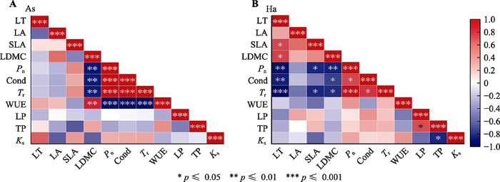 骆驼刺(As)和梭梭(Ha)的性状之间的相关性。Cond, 气孔导度; Ks, 枝比导率; LA, 叶面积; LD, 叶直径; LDMC, 叶干物质含量; LP, 叶水势; LT, 叶厚; Pn, 净光合速率; SLA, 比叶面积; TP, 枝水势; Tr, 蒸腾速率; WUE, 水分利用效率。
