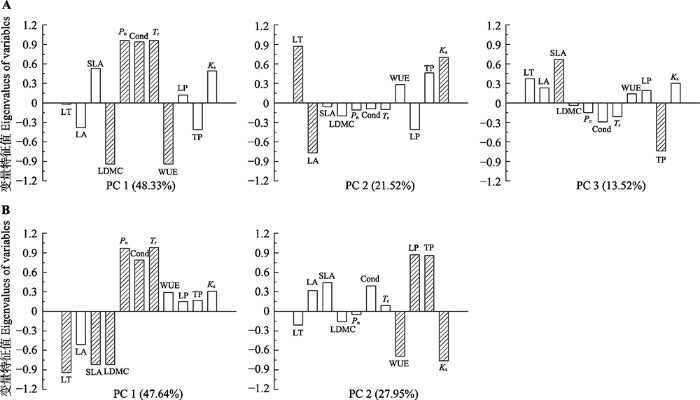 骆驼刺(A)和梭梭(B)干旱胁迫下11个性状的主成分(PC)分析结果。Cond, 气孔导度; Ks, 枝比导率; LA, 叶面积; LD, 叶直径; LDMC, 叶干物质含量; LP, 叶水势; LT, 叶厚; Pn, 净光合速率; SLA, 比叶面积; TP, 枝水势; Tr, 蒸腾速率; WUE, 水分利用效率。