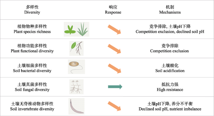 1)外源氮输入导致草地植物物种多样性和功能多样性下降, 降低土壤细菌多样性, 对真菌多样性的影响较弱。其中, 植物物种和功能多样性的下降主要由资源竞争和土壤酸化两种机制驱动, 而土壤细菌多样性的下降则更多与土壤酸化有关。