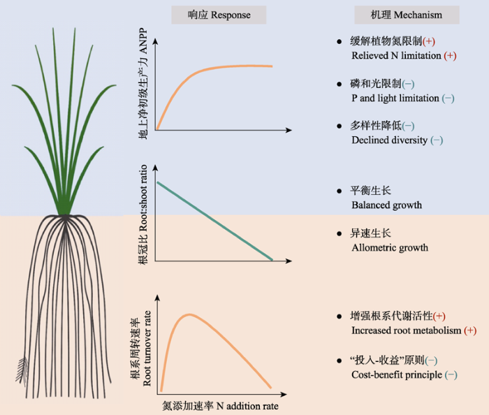 植被生产力及其分配对氮输入的响应及其主要机制。正号表示氮输入的促进效应, 负号表示氮输入的抑制效应。