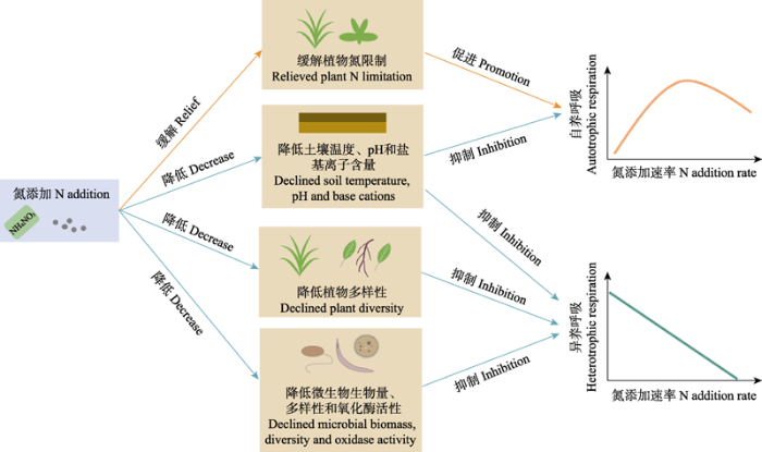 Responses of soil respiration to nitrogen (N) input and their primary mechanisms.