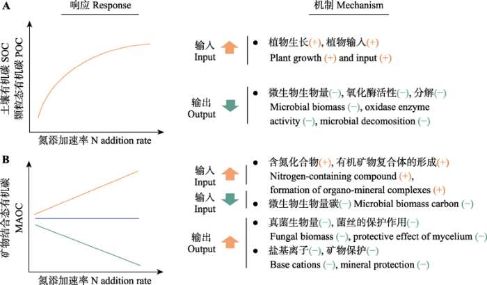 不同土壤碳组分对氮输入的响应及其主要机制。向上的箭头或者正号表示氮添加的促进效应, 反之则表示氮添加的抑制效应。