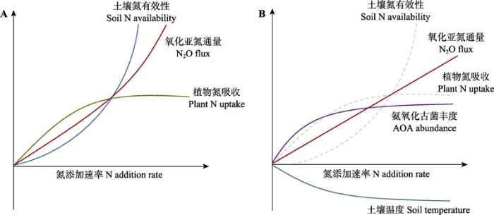 热带-温带草地(A)和高寒草地(B)生态系统土壤N2O排放对氮输入的响应及主要其机制。