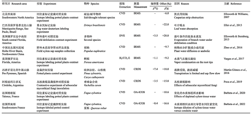 +、-在数字前分别代表同位素富集与贫化,数值代表了植物茎干木质部与土壤层同位素平均比值的偏移量; -,无数据; CRDS,腔衰荡光谱; CVD,低温真空蒸馏; DVE,直接水汽平衡; H/CO2 E, H/CO2平衡; IRMS, 同位素比率质谱; OA-ICOS,离轴集成腔输出光谱。