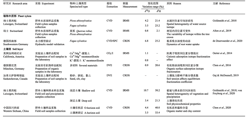 表2 植物木质 部和土壤层中氢氧同位素比值(δ)自然变化范围研究的主要文献及结果