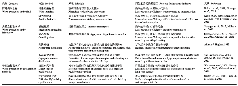 表3 部分样 品提取方法的原理和产生稳定氢氧同位素数据偏差的原因
