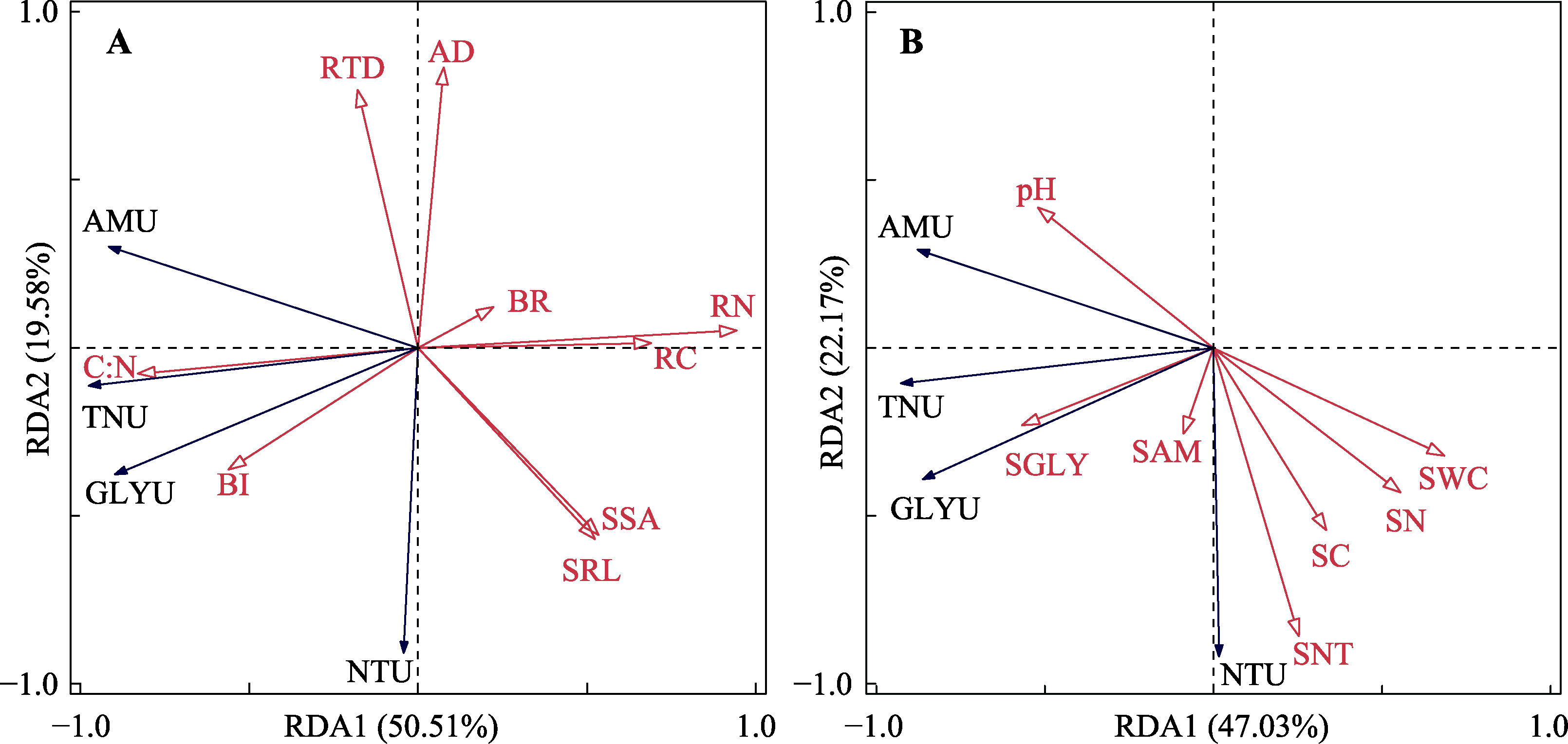 | Fig. 4 Redundancy analysis (RDA) on the influence of root traits (A) and soil characteristics (B) on nitrogen uptake rates of four plants in Bashang region, Hebei. AD, root average diameter; AMU, ammonium nitrogen uptake rate; BI, root branching intensity; BR, root branching ratio; C:N, the ratio of root carbon to nitrogen content; GLYU, glycine nitrogen uptake rate; NTU, nitrate nitrogen uptake rate; RC, root carbon content; RN, root nitrogen content; RTD, root tissue density; SAM, soil ammonium nitrogen content; SC, soil organic carbon content; SGLY, soil glycinate nitrogen content; SN, soil total nitrogen content; SNT, soil nitrate nitrogen content; SRL, specific root length; SSA, root specific surface area; SWC, soil water content; TNU, total nitrogen uptake rate. |
