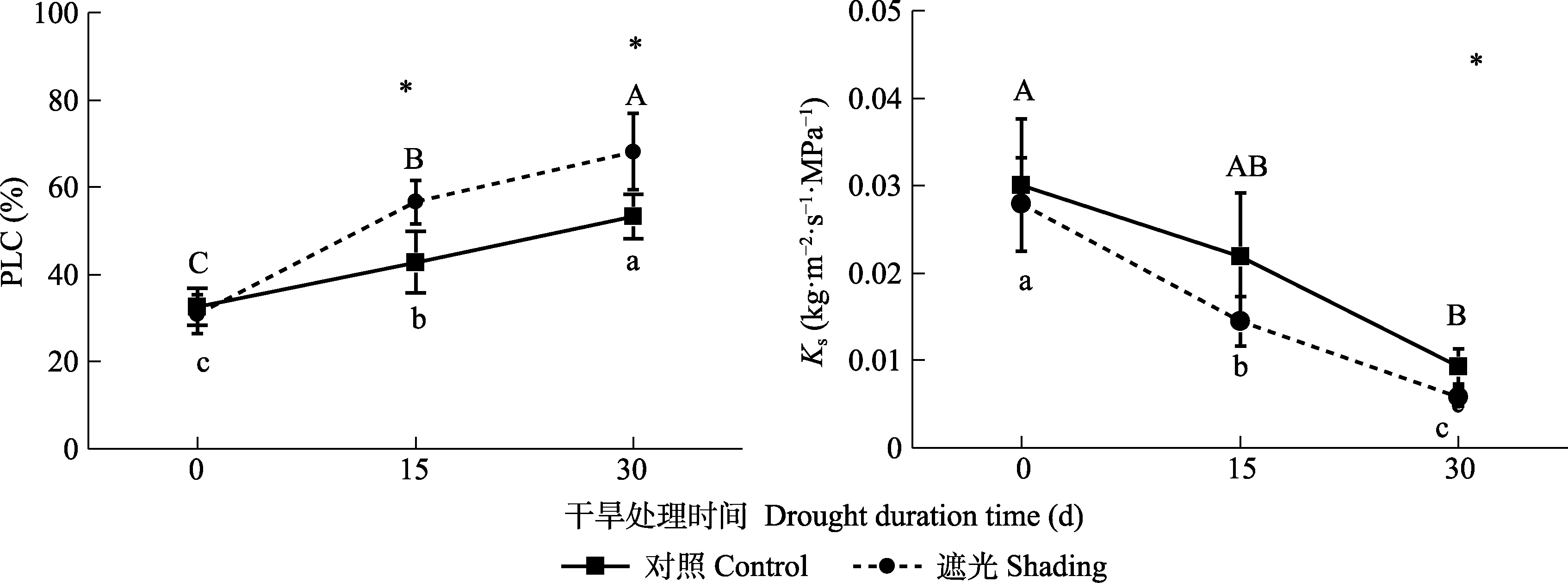 | 图2 干旱条件下导度损失率(PLC)和边材比导率变化(Ks) (平均值±标准差, n = 5)。不同大小写字母表示同一处理不同干旱时间存在显著差异。*表示在p < 0.05水平下相同干旱时间对照组和遮光组之间的差异显著。 |